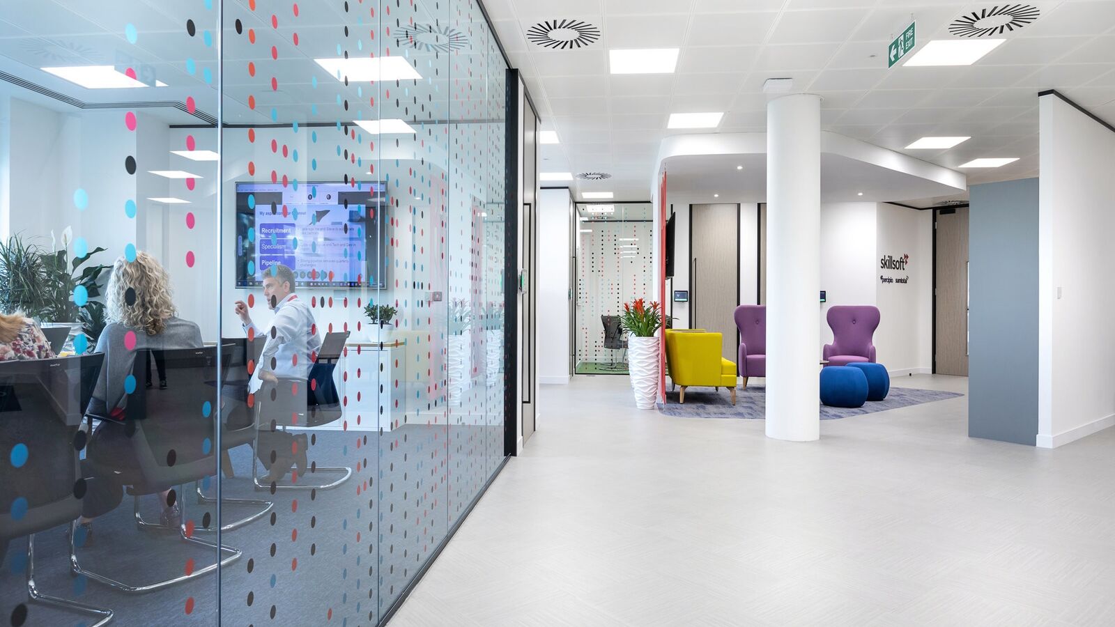 Skillsoft is the global leader in corporate learning. The new office for Skillsoft was an opportunity to change their culture and adopt more dynamic ways of working. The space is split into Front Of House and Back Of House. The Front Of House has a mixture of formal and informal meeting rooms allowing for flexibility. The Staff area benefits from height adjustable desks and a beautiful breakout apace that encourages the teams to get together for socials as well as work. The space is fresh, bright and airy with splashes of colour from branding.